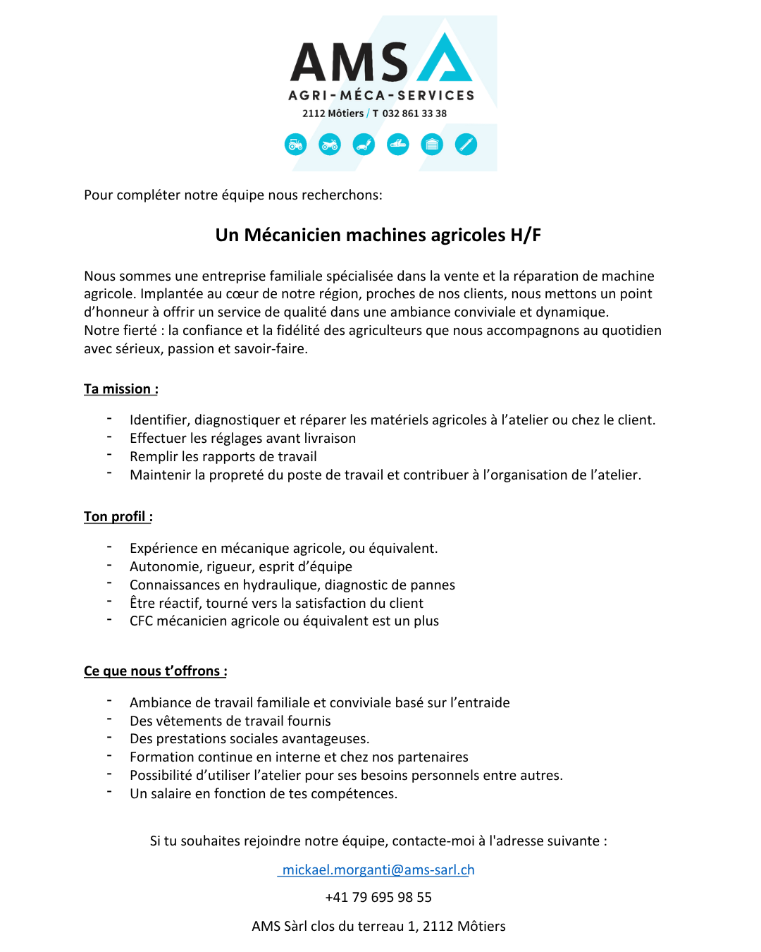 Chez AMS Sàrl, les valeurs se perdurent! Sérieux, réactivité, polyvalence et proximité font le socle de notre entreprise. Partenaire des agriculteurs, des professionnels et particuliers depuis plusieurs années.